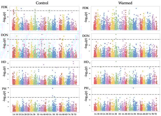 Manhattan plots of genome-wide association study (GWAS) was performed for Fusarium damaged kernels (FDK), deoxynivalenol (DON), heading date (HD) and plant height (PH). GWAS results of 238 soft red winter wheat cultivars and breeding lines from the T-CAP panel grown in a control treatment and warmed treatment in Lexington, KY, 2017.