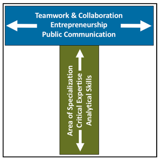 T-training results in a broad skillset [3]. In most graduate programs, disciplinary skills listed in the stem of the letter ‘T’ constitute the full training regime (green). For P3, cross-cutting skills matching the horizontal box are also developed (blue).