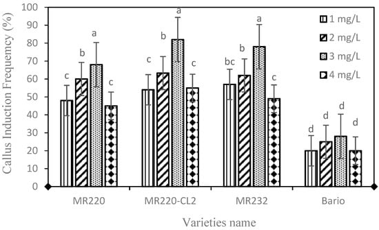 Calli induction frequency in four indica rice varieties (MR220, Mr220-CL2, MR232, and Bario) supplemented with different concentration of 2,4-D (2, 4-dichlorophenoxyacetic acid) on MS (Murashige and Skoog) basal media after 3 weeks of culture. Mean values of calli induction frequency marked with the same letters do not differ significantly (P ≤ 0.05) in Tukey’s test. Vertical bars represent ± SD (n = 3).