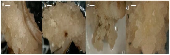 The callus morphology of four different rice varieties (MR220, MR220-CL2, MR232, and Bario) are presented in Figure 2a–d. The seeds cultured onto MS media supplemented with 3 mg/L 2,4-D, produced calli that were compact, nodular, dry, iso-diametric, and had a relatively whitish to light yellowish color with a smooth surface (Figure S1). In contrast, non-embryogenic calli had loosely held cells, were watery and yellowish to brownish in color. Our finding was in agreement with the previous rice calli induction works [41,49]. Based on color and structural morphology, the calli obtained from the present experiment were mostly embryogenic on MS media containing 3 mg/L 2,4-D. Previous literature illustrated that 2,4-D was effective for callusing in several other Malaysian indica rice [58], which corroborates the present study.
