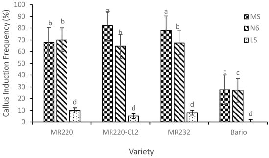 Callus induction frequency for four Malaysian rice varieties cultured on different basal media MS, N6, and LS media. Mean values marked with the same letters do not differ significantly (p ≤ 0.05) in Tukey’s test. Vertical bars represent ± SD (n = 3).