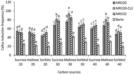 Callus induction frequency of MR220, MR220-Cl2, MR232, and Bario varieties cultured on MS media supplemented with 3 mg/L 2,4-D treated with different carbon sources were evaluated. Mean values marked with the same letters do not differ significantly (p ≤ 0.05) in Tukey’s test. Vertical bars represent ± SD (n = 3).