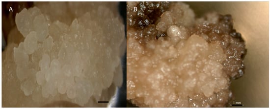 Callus morphology of 30 g/L Maltose (A) and sucrose (B) on MS media supplemented with 3 mg/L 2,4-D. Bar = 1 mm.