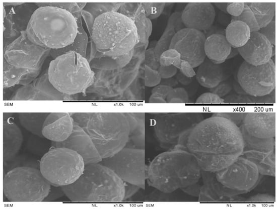 Scanning electron microscopic observation of callus culture of 4 varieties (A) MR220; (B) MR220-CL2; (C) MR232, and (D) Bario showing the globular and unfolded callus structure to differentiate the cells of the embryogenic callus from the 4 week culture. Bar (A,C,D) =100 µm, B = 200 µm.
