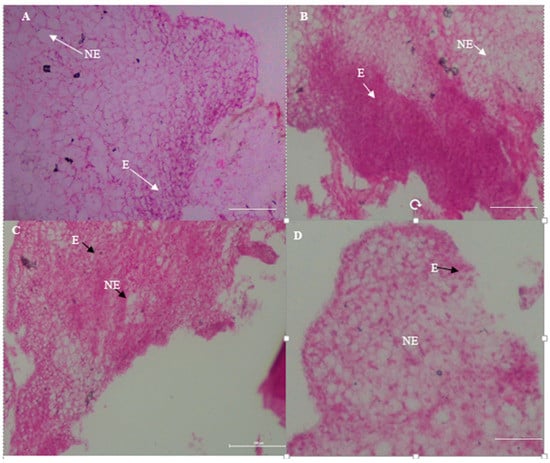 The histological study was conducted to observe the microscopic anatomy of embryogenic (E) and non-embryogenic (NE) calli from all varieties. Samples from four different varieties were fixed in FAA to preserve the cells. The calli were then dehydrated through different grades of ethanol in a series for 48 h and embedded in paraffin wax using Tissue Embedding System 2900 (TEC) (Histo Line Laboratories, Milan, Italy). Finally, the specimens were sectioned into 5 µm sections and stained with hematoxylin. The sections were then mounted on slides and observed under a light microscope (Nikon Eclipse E200, Japan). The above protocol was followed according to Liu et al. and Vega et al. [50,54].