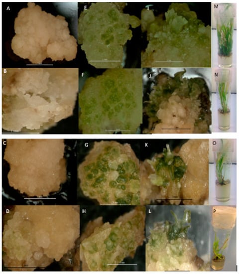 The callus induction frequency and plantlet regeneration were recorded for three replicates. The data analyses were conducted using SPSS software version 22.0 (SPSS, Chicago, IL, USA) where mean differences were evaluated using Tukey’s test. The differences were considered statistically significant when p ≤ 0.05. Different means were marked with different letters (a, b, c, d, e) in order to represent the significant value of the differences.