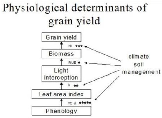 A physiological framework for grain yield in mungbean and the potential for genetic/agronomic manipulation of photo-thermal sensitivity (°C d), light extinction coefficient (k), radiation use efficiency (RUE), and harvest index (HI) is compared through the number of asterisks.