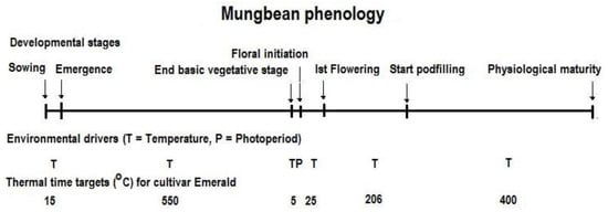 The optimum temperature for mungbean growth is 28 to 30 °C [88] and although the crop has a base temperature of around 7.5 °C, it requires average soil temperatures of >15 °C for effective germination. Mungbean does not tolerate high temperatures above 40 °C during the reproductive stage with major reduction in pollen viability [89].