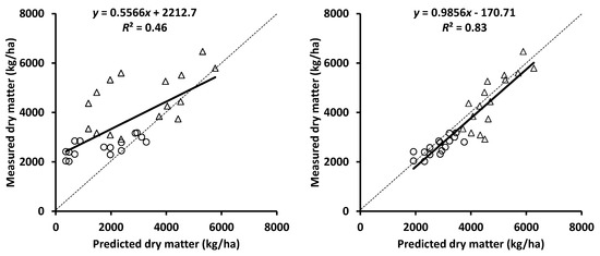 Relationship between observed dry matter and that predicted using the APSIM mungbean model with extinction coefficients ranging from 0.3 to 0.58 (left panel) and 0.45 to 0.58 (right panel) for the mungbean cultivar ‘Crystal’ at 57 days after sowing at Emerald (circle) and 97 days after sowing at Hermitage (triangle) [48].