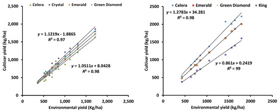 An example of the extent of G × E interactions in a mungbean trial with common cultivars (left panel) in multi-location trials and simulated (right panel) by the improved APSIM mungbean model [48].