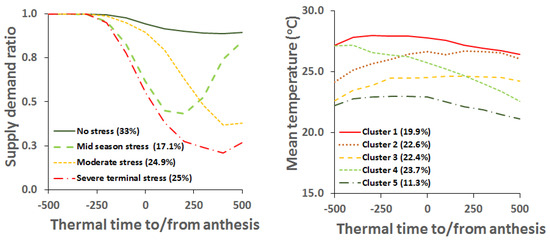 There are five types of thermal environments that mungbean experiences in the northern grains region in Australia (Figure 7B). These thermal environments were average ambient temperature for each 100 °C d during crop growth—as for drought [37]. In most situations, average temperatures remained less than the optimum, but trends differ. In some cases, temperatures started and increased during crop growth and development. In other cases, temperatures decreased during crop growth.