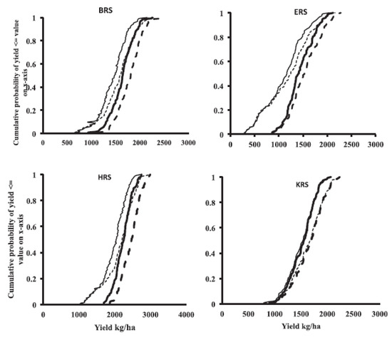 Cumulative probability of simulated yield distributions for the mungbean cultivar ‘Crystal’ at different row and starting moistures across four sites. Planting at 50% total plant-available water holding capacity (PAWC) in wide rows (1 m) is shown with thin continuous lines, and narrow rows (0.5 m) with thin dash lines, or at 100% PAWC with wide (thick continuous lines) and narrow rows (thick dash lines). The four sites are Biloela (BRS), Emerald (ERS), Hermitage (HRS), and Kingaroy (KRS). Yields were simulated for rain-fed crop using site-specific soil properties and historical climate data over 123 years [24].