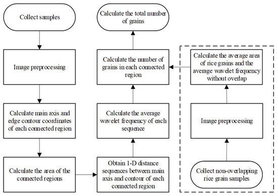 First, the area of each connected region was calculated, and then it was divided by the average area of rice grains to get estimated value of grains in each connected region. Secondly, the average wavelet frequency of the edge contour sequence in each connected region was calculated, and the correction coefficient was obtained by dividing it by the average wavelet frequency without overlap. Then, the estimate values were multiplied by the correction coefficient to obtain the corrected values. When the estimated value was less than 1, the estimated value was taken as 1, and the correction coefficient was also taken as 1. As such, we could obtain the number of rice grains in each connected region, and after summing them up we could obtain the total number of rice grains in the image.