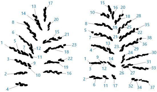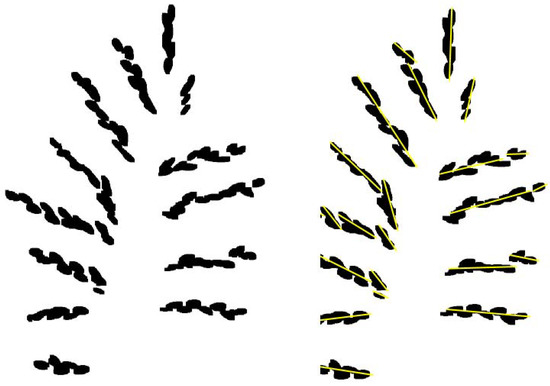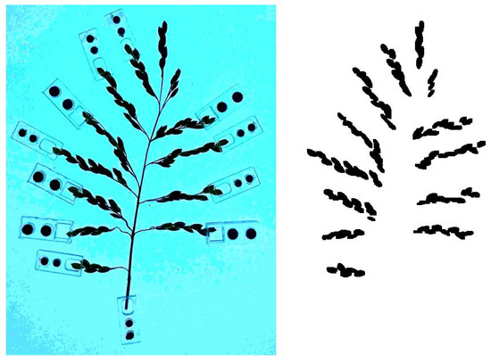 It is necessary to preprocess the image to obtain the morphological characteristics of the rice panicle image. Preprocessing operations include binarization, circle detection, corrosion and expansion and hole filling. Binarization could divide the rice panicle from the background, and circle detection was used to remove the black round magnets in the image. Corrosion and expansion operations were used to remove the stems of the rice panicle in the image. In this paper, the image processing environment was based on MATLAB R2016b (The MathWorks Inc., Natick, MA, USA). The preprocessed binary image is shown in Figure 2, which includes 23 connected regions.