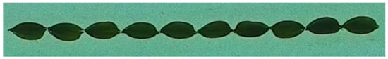 Firstly, we randomly selected 175 rice grains and placed them neatly in the Seed & Panicle Phenotyping Instrument. Secondly, a picture of these rice grains was obtained, and we transformed it into a binary image using the Otsu method. Then, the non-target objects in the image were removed. Finally, we calculated the average number of pixels in the 175 connected regions, which was the average area of one rice grain. In our experiment, the average number of pixels of rice grains was m0 = 2670.27. The sample image is shown in Figure 3.