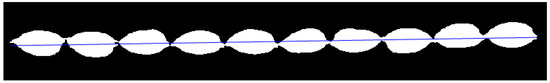 An experiment was conducted to measure the average frequency of the edge of rice grains in a sample in which the grains do not overlap. First, we put 10 rice grains in a row without overlap, which is shown in Figure 5, and apply Otsu method to the image to obtain the binary image. Then, we calculated the main axis of the connected region, which is shown in Figure 6.