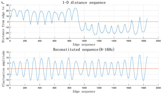 According to the main axis la and the edge coordinate sequence , the distance from each edge point to la was calculated, which constituted a 1-D sequence . The wave chart of is shown in Figure 7. 1-D continuous wavelet transformation with 3rd order symmetric ‘Morlet’ wavelet was applied to , whose sampling frequency was defined by 1000 Hz. The time-frequency diagram of is shown in Figure 8. A wavelet coefficient matrix was obtained after continuous wavelet transformation to . It could be observed that in the absence of overlap, the fluctuation frequency of the edge of rice grains was between 8 Hz and 16 Hz in our experimental conditions. Therefore, the wavelet reconstruction was performed on the sequence from 8 Hz to 16 Hz to obtain the main fluctuation information, and the reconstruction sequence was denoted as . The result is shown in Figure 7.