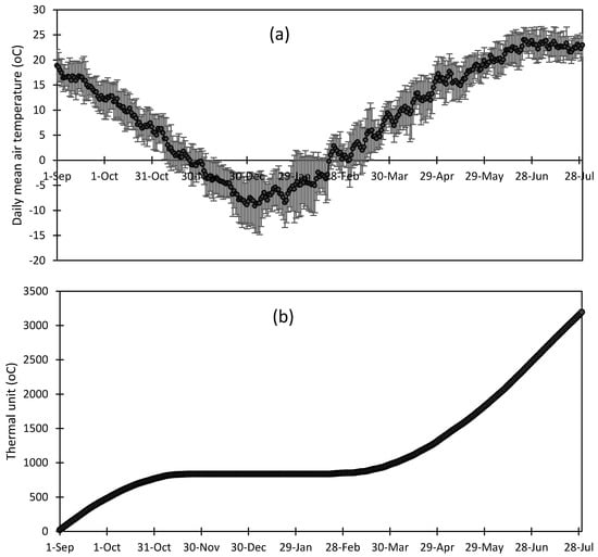 Trends in (a) (2002–2014) average daily air temperature and (b) thermal unit from September 1st to July 31st.