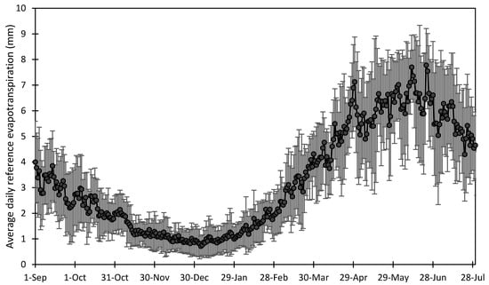 Seasonal average climatic condition is summarized in Table 1. Seasonal average wind speed varied from 2.7 to 3.8 m/s. The strongest wind speed (3.8 m/s) was obtained during winter wheat growing season 2010–2011. Seasonal average Tmax varied from 12.0 to 16.6 °C; Tmin varied from 1.7 to 3.5 °C and the seasonal average mean air temperature varied from 6.8 to 10.0 °C. Winter wheat season 2008–2009 was the warmest season and the 2002–2003 season was the coldest during the study period. Average daily mean air temperature decreased from 18 °C early September to −9 °C in January and increased thereafter and reached 23 °C in July (Figure 1a). Average daily air temperature was below winter wheat base temperature (0 °C) from November 24 to February 21st that correspond to the winter wheat dormancy period with no growth occurring during that period. No accumulation on thermal unit occurs during that period as shown in Figure 1b. Seasonal average relative humidity varied with the growing seasons and ranged from 46.1 to 68.8%. The 2010–2011 season was the driest one and the 2002–2003 season was the wettest. Less variation was observed in the seasonal average solar radiation which varied from 14.6 to 16.2 MJ m−2. The least solar radiation was received during the 2002–2003 season while the greatest was received during the 2007–2008 growing season. Daily reference evapotranspiration (ETo) at the site had similar trends as the average air temperature and decreased from 4 mm early September to 0.8 mm early January and increased thereafter to 7.7 mm around mid-June and decreased again toward the end of July (Figure 2). Daily ETo was at its minimum value during winter wheat dormancy period and increased with warmer air temperature after the very low air temperatures during December (Figure 1a,b and Figure 2).