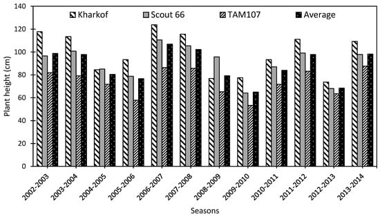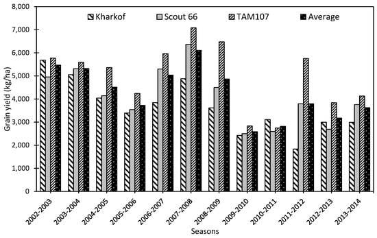 Winter wheat yield varied significantly with varieties and seasons and ranged from 1843.1 to 7085.7 kg/ha. Grain yield LSD values were 1232, 1507, 973, 1103, 1125, 1008, 935, 1025, 1088, 960, 1324, and 338 kg/ha for the respective growing seasons from 2002–2003 to 2013–2014. The variety TAM107 obtained the highest average yield of 4.983 kg/ha followed by Scout 66 with 4121.1 kg/ha and Kharkof with 3655.6 kg/ha. Kharkof grain yield varied from 5683.5 to 1834.1 kg/ha; Scout 66 grain yield varied from 2500.2 to 6360.3 kg/ha; TAM107 grain yield varied from 2743.4 to 7085.7 kg/ha (Figure 4). The highest seasonal yield of Kharkof was obtained in 2002–2003, while the Scout 66 and TAM107 showed their highest yield during the 2007–2008 season. Among the three varieties used in this study, TAM107 showed significantly higher yield from 2005 to 2009 and in 2012 and 2013. Overall Winter wheat grain yield decreased with years as shown in Figure 5 and this trend is likely biased by the 2011 and 2012 years which historic drought years. Wheat yield show poor relationship with total water supply (Table 4). The findings of this study are greater than the results reported by Graybosch and Peterson [6] who found average Kharkof grain yield for the 1959–2008 period that varied from 1755 to 2918 and averaged 2347 kg/ha across the Great Plains of North America. Morgan [28] reported winter wheat grain yield of seven genotypes varying from 3800 to 7400 kg/ha averaged 3900 kg/ha. Zhong and Shangguan [29] indicated winter wheat grain yield range of 4162–7597 kg/ha and 5407–8199 kg/ha during two growing seasons using two genotypes on the Loess Plateau, China. Baenziger et al. [30] reported Scout 66 yield of 2795 kg/ha in Southeast, 3581 kg/ha in West Central, 2217 kg/ha in South Central and 3144 kg/ha in West. Peck and Kirkham [31] reported that irrigated winter wheat yield averaged 4470 kg/ha under modified irrigation, 3640 kg/ha under normal irrigation and 1660 kg/ha under rainfed conditions at the at the Panhandle Research Station, Goodwell, Oklahoma. Irrigation management might have impacted the great variation in winter wheat yield with year as the application of irrigation early spring may increase excessive biomass production with reduced harvest index at crop maturity [32]. Liu et al. [9] found spatial variability in the irrigated winter wheat yield across China and ranged from 2236 to 4737 kg/ha in the NCP provinces, from 1563 to 4135 kg/ha in the Northwest provinces, from 1281 to 3483 kg/ha in the Southwest provinces, and from 1544 to 3425 kg/ha in the Southeast provinces. The decreasing trend in winter wheat yield revealed by the present study is in agreement with some previous studies. Decrease in winter wheat was reported by Porter and Gawith [33] and Hatfield et al. [34] who indicated that shorter growing period and decrease in plant photosynthesis and carbohydrate accumulation are the main causes due to global warming that is shortening wheat phenology [35]. Yang et al. [36] indicated that wheat yield under full irrigation had no significant decreasing trend for the period of 1955 to 2006. Fogarasi et al. [37] showed that slightly decreasing yields is projected for the next three decades for winter wheat and maize. Decrease of diurnal air temperature range resulted in 2.9% decrease in maize winter wheat production in China from 1961 to 2010 [38].