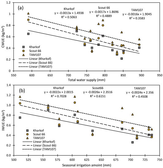 Winter wheat CWUE varied with seasons and varieties. Tam107 showed the highest CWUE amount the tested varieties. It ranged from 0.22 to 0.70 kg/m3 for Kharkof, from 0.30 to 0.90 kg/m3 for Scout 66 and from 0.34 to 1.01 kg/m3 from TAM107 and averaged 0.45, 0.53, and 0.64 kg/m3 for the respective wheat varieties. CWUE had linearly decreasing relationship with seasonal water supply (Figure 6) and a positive relationship with grain yield with R2 values of 0.87, 0.88 and 0.85 for Kharkof, Scout 66 and TAM107, respectively (Figure 7a). CWUE varied from 0.36 to 1.42 kg/m3 across China with the greatest CWUE obtained in the North China Plain provinces and the lowest Liu et al. [9].