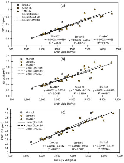 Relationship between winter wheat (a) crop water use efficiency (CWUE), (b) irrigation water use efficiency (IWUE), and (c) evapotranspiration water use efficiency and grain yield (ETWUE).