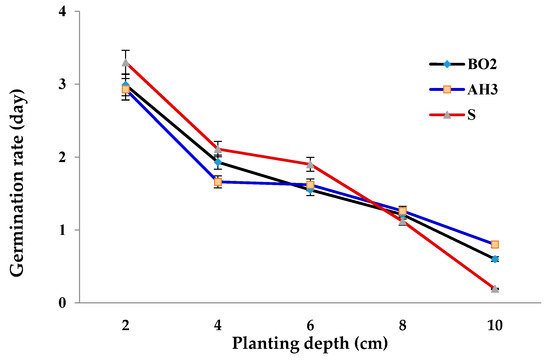 The decreasing rate of germination (3.4) was more evident in the HF population than the resistant ones, while the slope for AH3 was 2.9 while for the BO2 resistant mass it was 2.8. The three populations showed a decrease in the germination rate with increasing depth. On the soil surface (0 cm), the highest GR was observed in the S population and at the final depth (8 cm). The germination rate in the BO2 and AH3 populations was similar, but the HF population showed a decrease in comparison with the other populations. In general, with increasing depth, the maximum germination rate decreased, but the decrease in the S population was lower than that of resistant populations (Figure 1).