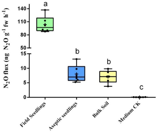 The N2O flux of the “medium CK” group (chamber units which contained sterilized soil only) was measured first, showing no measurable emission from this group, which indicated that sterile soil did not interfere in the N2O measurement, as well as in the chamber devices. The N2O flux of differently treated plants were within a range of 5 to 140 ng N2O g−1 fw h−1 (Figure 2). Field seedlings presented the highest flux (111.7 ± 25 ng N2O g−1 fw h−1), while the flux from aseptic seedlings was 8.56 ± 2 ng N2O g−1 fw h−1. Statistically, the field seedlings showed significantly higher fluxes than aseptic seedlings (p = 0.0002) (Figure 2). Moreover, the amount of N2O emitted from bulk soil samples was similar to the aseptic seedlings (p = 0.13) at 6.81 ± 2 ng N2O g−1 fw h−1 (Figure 2).