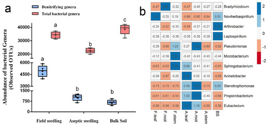 (a) Bar plot showing the abundance of total aerobic denitrification related genera and total bacterial genera from a holistic perspective. t-test analysis indicates high significant differences obtained from the abundance of denitrifying genera in field seedlings (p < 0.05). The same letter on the bars indicate no significant differences between means at (p < 0.1). (b). Heat map showing the distribution of denitrification related genera in differently cultured soybean organs and bulk soil. The colour of the squares on the left indicates the relative abundance of the genera in each group. Normalized relative abundance (from 2 to −2) was marked on the colour block.