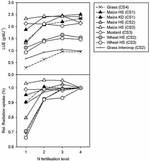 - Muchow, R.C.; Sinclair, T.R. Nitrogen response of leaf photosynthesis and canopy radiation use efficiency in field-grown maize and sorghum. Crop Sci. 1994, 34, 721–727. [Google Scholar] [CrossRef]