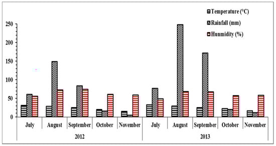 Monthly rainfall, average temperature and humidity from July to November in the crop periods of 2012 and 2013.