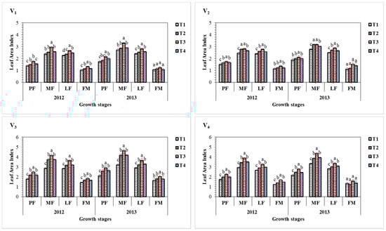 Variations in leaf area index (LAI) of sesame varieties as affected by sulphur treatments during 2012 to 2013 cropping season. PF, MF, LF and FM refer to four sesame growth stages pre-flowering, mid-flowering, late-flowering and full-maturity described by Langham (2007), V1, V2, V3 and V4 represent four sesame varieties SG-27, SG-30, SG-36 and SG-51 and T1, T2, T3 and T4, represent four sulphur treatments 20, 30, 40 and 50 kg S ha−1 respectively. All the values are average of four replicates. Bars show ± standard errors, (n = 3). Bars with the same letter are not significantly different (p < 0.05).