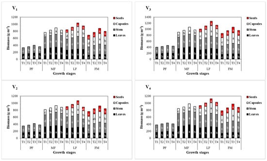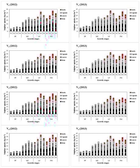 We also assessed the biomass partitioning in stem, leaves, capsule and seed of sesame varieties in response to sulphur treatments (Figure 5). The biomass partitioning among plant organs changed significantly at PF, MF, LF and FM in all sesame varieties. At PF and MF, when reproductive parts were the weak sink, maximum translocation of biomass was noted in stems followed by leaves. After that, at LF the pattern of biomass partitioning re-translocated and major part of the biomass distributed to reproductive parts (capsule and seed) in all sesame varieties []. At LF, decreased the translocation of photosynthates to stem and leaves, while increased biomass partitioning to seed was observed under 40 kg S ha−1 application which might be due to increased translocation of assimilates to reproductive organs at maturity [,,,]. Moreover, previous researchers reported the photosynthetic ability of pea [] and soybean []. It is possible that S treatments initiated the photosynthetic activity of capsule and accelerated the utilization of assimilates from the stem for seed growth. In the present experiment, seed yield of sesame varieties was increased with S fertilization. This increase in seed yield might be due to the improvement in LAI, the synthesis of additional chlorophyll content, higher photosynthetic rate and cell division, more translocation of photosynthates towards capsule and seed than vegetative parts because higher partitioning of photosynthates towards sink increased with S fertilization [] Furthermore, seed yield is related to the crop growth rate of crops [] and 40 kg S ha−1 considerably increased the growth rate of sesame varieties under rainfed conditions []. The TSA by sesame varieties was improved by applying S at the rate of 40 kg ha−1 (T3) however, the level of response varied among sesame varieties (Figure 4). Our results are in accordance with the previous studies that revealed that S accumulation in sesame plants was increased with the increased application of S, sesame and oilseed rape has shown to accumulate sulphur up to 40 and 100 kg ha−1, respectively [,]. The highest TSA observed in this study is attributable to both optimum availability of S during the early growth stages of the crop which in turn increased the total biomass production. Therefore, we concluded that in S deficient field areas, application of S can promote the vegetative and reproductive growth of sesame plants under rainfed conditions. The S distribution in different plant organs significantly changed in all sesame varieties. The S content in stems, leaves, capsules and seeds of V3 was recorded considerably higher than other sesame varieties (V1, V2 and V4) as a result of higher biomass accumulation and partitioning in reproductive parts (Figure 3). Our findings are consistent with the results of others, they reported changed S distribution in different plant tissues using different sesame and rapeseed [,,].