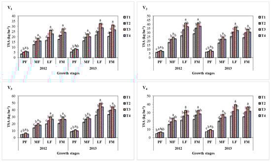 Total sulphur accumulation (TSA) in sesame varieties as affected by sulphur treatments during 2012 and 2013 cropping seasons. PF, MF, LF and FM refer to four sesame growth stages pre-flowering, mid-flowering, late-flowering and full-maturity described by Langham (2007), V1, V2, V3 and V4 represent four sesame varieties SG-27, SG-30, SG-36 and SG-51 and T1, T2, T3 and T4, represent four sulphur treatments 20, 30, 40 and 50 kg S ha−1 respectively. Within a bar, different lowercase letters show a significant difference (p < 0.05) between treatments. All the values are average of four replicates.