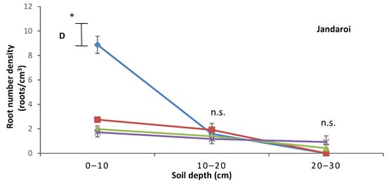 Changes in (A,B) root length density and (C,D) root number density with soil depth in salt-tolerant (Janz) and salt-sensitive (Jandaroi) wheat cultivars in response to salinity, low P supply, and their interaction. Measurements were made at the end of the experiment (40 DAS). Values are the means ± SE of three replicates (nine plants). The vertical bars represent the least significant difference value at p = 0.05 * and n.s., non-significant.