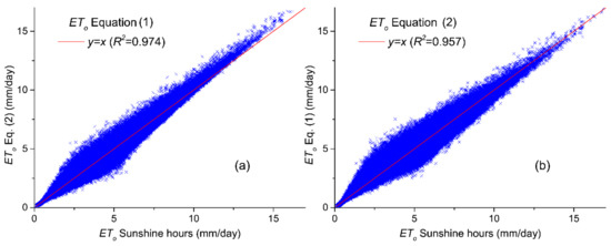 Comparison of ETo values calculated using solar radiation values estimated by sunshine hour data with values calculated based on (a) Equation (1) and (b) Equation (2) for all the data points that sunshine hours data were available.