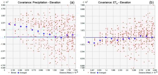 Cross-covariance between (a) precipitation and elevation and (b) ETo and elevation.
