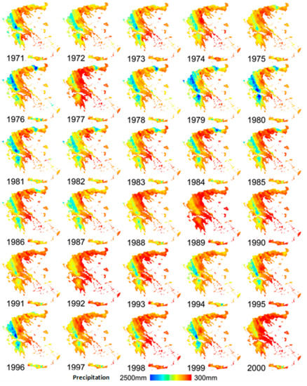 As can be seen in Figure 5, there is a vast spatial variability, which is present in both wet and dry years. The influence of the steep relief and especially of the massive sierra dividing the mainland of the country is also profound. Annual precipitation depths range from almost 2500 mm/year at the higher elevations at the northwest to almost 300 mm/year at the lower elevations at the southeast of the country and especially at the central Aegean islands. The presence of high temporal variability is also highlighted. As can be seen, there are some very wet years (e.g., 1979) and some very dry years (e.g., 1989). The big drought that lasted from 1988 to 1993 and caused major water shortages problems is also illustrated in Figure 5. What is also interesting is that the above observations are very similar with the general patterns presented in previous studies using different geostatistical methodologies and different datasets [26,36]. This fact supports the validity of the obtained results