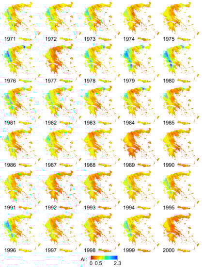 Using the interpolated P and ETo layers, the Aridity Index (AI) layers corresponding to each year of the 30-year reference period were calculated as follows: