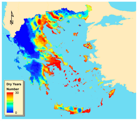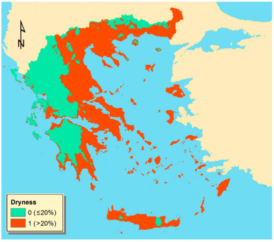 Based on the AI surfaces, a raster representing the number of years during which the dryness threshold is fulfilled (AI values ≤ 0.5) was computed as can be seen in Figure 9. The areas subject to dryness are the areas with a number of dry years greater or equal to 20% of the total reference period. The final results are illustrated in Figure 10, where the cells with a value of 1 represent those areas subject to constraints due to dryness. As can be observed, the areas subject to dryness are mainly located at the southeast part of the country and at lower elevations. Though, the eastern part of the country is also the most populated and where the biggest cities are located. Besides, the three most important and most productive plains are also located at the eastern part of the country (Thessaly, Thessaloniki, and Strymonas river valley). This fact leads to very high irrigation water needs at the eastern and mostly dry part of the country as it is also reported by Soulis and Tsesmelis [26], putting a lot of pressure on water resources.