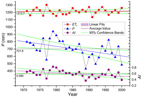 Finally, climate variability and the presence of trends in the time series were investigated. To this end, the areal P, ETo, and AI statistics were calculated for each of the 30 years and then their variability and possible trends were analyzed. Furthermore, the corresponding linear regression lines were fitted to the areal average of the annual P, ETo, and AI values and the corresponding 95% confidence bands were calculated. The significance of the difference of the corresponding slope values from 0 at the 0.05 confidence level was evaluated as well.