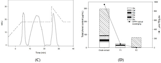 The phenolic compounds present in the crude extract may have different antioxidant activities. Therefore, the crude extracts and the fractions obtained after purification were fixed at 18 μg/mL to better evaluate the antioxidant activity. A comparison amongst the data is presented herein in order to obtain information related to the influence of the different polyphenolic compounds on the antioxidant activity. The UAE crude extract presented higher antioxidant activity (944 μmol TE/g dw) than the maceration crude extract (867.31 ± 36.36 μmol TE/dw). Antioxidant activity of F1 of maceration extract was higher (585.51 μmol TE/g dw) than F1 of UAE (80.00 ± 6.29 μmol TE/g dw). Although diosmin and ferulic acid were the predominant phenols in F2, UAE did not reveal antioxidant activity unlike F2 maceration extract (358.13 ± 20.31 μmol TE/g dw). In regards to these results, it can be suggested that the antioxidant activity is higher due to a synergic effect by the mixture of phenolic compounds present in the crude extract.