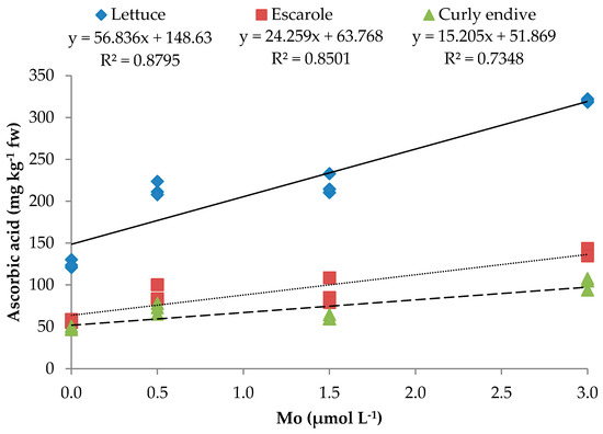Curly endive plants had the lowest content of ascorbic acid, three times lower than lettuce plants (Table 3). MNS that were not supplemented with Mo induced a significant reduction of the ascorbic acid content (124.9, 57.5, and 48.2 mg kg−1 FW for lettuce, escarole, and curly endive, respectively) against those that contained the recommended dose of Mo (0.5 µmol L−1) (214.3, 89.0, and 71.9 mg kg−1 FW for lettuce, escarole, and curly endive respectively). A further significant and linear increase of the ascorbic acid content was obtained by raising the amount of Mo in the nutrient solution up to 3.0 µmol L−1 (Table 3 and Table 4; Figure 1).