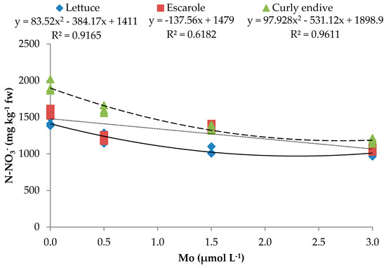 Molybdenum plays a key role in the synthesis of nitrate reductase. Its deficiency leads to accumulation of high concentrations of nitrates in many plants. On the contrary, Mo fertilization was effective in reducing nitrate content in the leaves of lettuce [33], spinach [50], and poinsettia [51,52], as well as in leaves, petioles, and the fruit of eggplant [5]. Like other authors, we found that lettuce, escarole, and curly endive plants subjected to Mo deficiency (0 µmol L−1) tended to accumulate high amounts of nitrates in their leaves (Table 3). Curly endive plants were the most sensitive to Mo deficiency; their nitrate content reached 1927.1 kg−1 FWwithout adding Mo to the nutrient solution. All the tested leafy vegetables, grown in hydroponics with increased Mo doses, significantly reduced their nitrate content. Lettuce was the most sensitive to Mo fertilization, as its nitrate content reached the lowest value (1006.9 kg−1 FW) with 1.5 µmol L−1 of Mo, while escarole and curly endive gradually dropped their nitrate content as the Mo concentration was raised up to 3.0 µmol L−1 (1047.3 and 1182.2 kg−1 FW, respectively). There was a linear negative relationship between the Mo rate and nitrate content in escarole (R2 = 0.618), while lettuce (R2 = 0.917), and curly endive (R2 = 0.961) followed a quadratic relationship, with the minimum of the fitted curve at 2.30 and 2.71 µmol L−1 of Mo, respectively (Table 4; Figure 2).