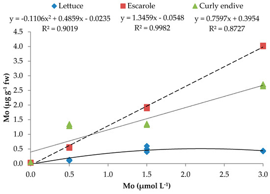 The level of Mo in the nutrient solution also influenced the amount of Mo found in leafy vegetables (Table 3). Plants grown without Mo added to the nutrient solution had a very low content of this element (0.02, 0.03, and 0.05 μg g−1 FW for lettuce, escarole, and curly endive, respectively). The presence of Mo in the leafy vegetables, even without Mo fertilization, might be due to low amounts of Mo naturally occurring in groundwater [53] or in fertilizer impurities [54]. All the plants increased their Mo content as Mo availability in the nutrient solution changed. Escarole plants tended to accumulate more Mo in their tissue than the other leafy vegetables. The amount of Mo found in lettuce plants increased up to 0.50 μg g−1 FW (1.5 µmol L−1 Mo); the plants’ Mo content fitted a quadratic equation (R2 = 0.902), with the maximum of the curve at 2.19 µmol L−1 of Mo. Escarole and curly endive linearly increased their Mo content up to 4.02 and 2.68 μg g−1 FW, with a positive relationship with the Mo rate (R2 = 0.998 and 0.873, respectively) (Table 4; Figure 3). The enrichment of leafy vegetables with Mo could affect their nutritional quality; thus, the occurrence of health-related issues due to an excessive Mo intake should be taken into account and carefully evaluated. The European Food Safety Authority [55] recommended an adequate intake (AI) for molybdenum of 65 μg d−1 for adult men and women. The tolerable upper intake level (UL) for adults was set at 0.6 mg d−1. The molybdenum content varied greatly among leafy vegetables tested and as a function of Mo fertilization. Lettuce had the lowest Mo content, ranging from 0.11 to 0.50 μg g−1 FW, while escarole varied from 0.55 to 4.02 μg g−1 FW (for 0.5 and 3.0 µmol L−1 of Mo in the nutrient solution, respectively). Our results showed that 100 g of leaves of lettuce, curly endive, and escarole, hydroponically grown with nutrient solutions containing Mo, provided a maximum of 50, 268, and 402 μg 100 g−1, respectively. Thus, a daily intake of 100 g of enriched lettuce, escarole, or curly endive would not lead to Mo toxicity. Nevertheless, the total intake level is also dependent on the intake of Mo from other food sources, on the amounts of copper and sulphur in the diet, and on the levels of other dietary constituents [56]. Therefore, the intake of more than 100 g of leafy vegetables hydroponically grown with nutrient solutions containing more than 1.5 µmol L−1 of Mo would not be advisable, especially for curly endive and escarole.