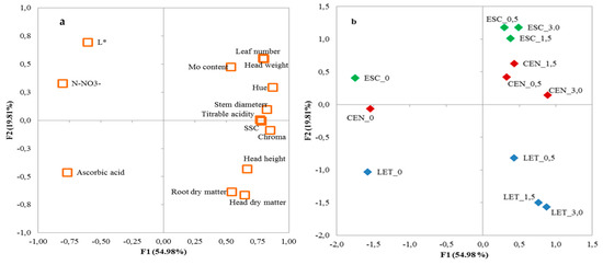 Plot of (a) loadings (agronomic and quality parameters of lettuce, escarole, and curly endive plants at harvest) and (b) scores (trials) formed by the first two principal components from the PCA analysis. LET_0, LET_0.5, LET_1.5, and LET_3.0: lettuce cultivated in nutrient solutions with 0, 0.5, 1.5, and 3.0 µmol L−1 Mo, respectively; ESC_0, ESC_0.5, ESC_1.5, and ESC_3.0: escarole cultivated in nutrient solutions with 0, 0.5, 1.5, and 3.0 µmol L−1 Mo, respectively; CEN_0, CEN_0.5, CEN_1.5, and CEN_3.0: curly endive cultivated in nutrient solutions with 0, 0.5, 1.5, and 3.0 µmol L−1 Mo, respectively.