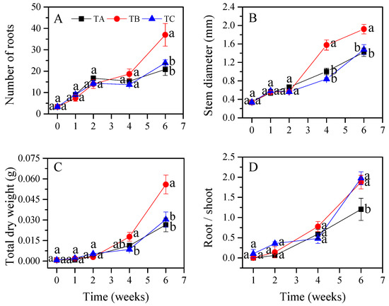 After the fourth week, the number of roots, stem diameter, and total biomass for seedlings in TB treatment were greater than those for seedlings in TA or TC treatment. There were no observable differences in the first four weeks (Figure 1). According to logistic growth curves, seedlings were in the lag phase of growth in the first four weeks, and grew slowly and steadily. Next, seedlings in different treatments went into the exponential phase and started displaying differences. Other research showed similar characteristics of seedling growth. For example, Arena and Radice [53] reported that shoot elongation in Berberis buxifolia Lam. presented a sigmoid curve. Cookson et al. [54] reported that the elongation of leaves, tendrils, and internodes in grapevine was fitted with sigmoid curves. Lin et al. [55] also reported that the initial stage of the fruit growth resembled a sigmoid curve.