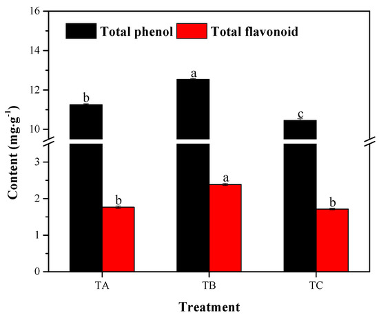 Contents of total phenol and flavonoid accumulated in leaves of A. triphylla (Thunb.) A.DC. seedlings grown under different temperature regimes after six weeks of cultivation. TA, 20/20 °C (day/night); TB, 25/15 °C; TC, 20/15 °C. Data is presented as the mean ± standard error (n = 3). The different letters (a, b, and c) indicate significant differences (p < 0.05) among treatments.
