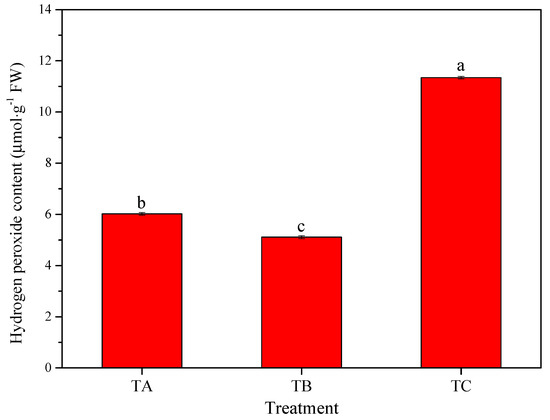 Under adverse ambient temperatures, including heat or chilling, ROS is rapidly accumulated, resulting in oxidative stresses and causes damages to cell structure and disorders in plant physiology [27,73,74]. Thus, the level of ROS in plants implies the degree of ROS-induced oxidative stresses. As a major ROS, H2O2 serves as an indicator of stress [75]. In our research, content of H2O2 in seedlings under TB was 5.11 ± 0.06 µmol·g−1 FW (fresh weight), significantly lower than for seedlings in TA (6.02 ± 0.06 µmol·g−1 FW) or TC (11.34 ± 0.05 µmol·g−1 FW) (Figure 3). A lower H2O2 content in seedlings under TB implied that seedlings had less stresses and grew better than seedlings in the other treatments.