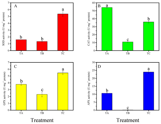 Activities of superoxide dismutase (A), catalase (B), glutathione reductase (GPX) (C), and ascorbate peroxidase (D) in leaves of A. triphylla (Thunb.) A.DC. seedlings grown under different temperature regimes after six weeks of cultivation. TA, 20/20 °C (day/night); TB, 25/15 °C; TC, 20/15 °C. SOD, superoxide dismutase; CAT, catalase; GPX, glutathione reductase; and APX, ascorbate peroxidase. Data is presented as the mean ± standard error (n = 3). The different letters (a, b, and c) indicate significant differences (p < 0.05) among treatments.